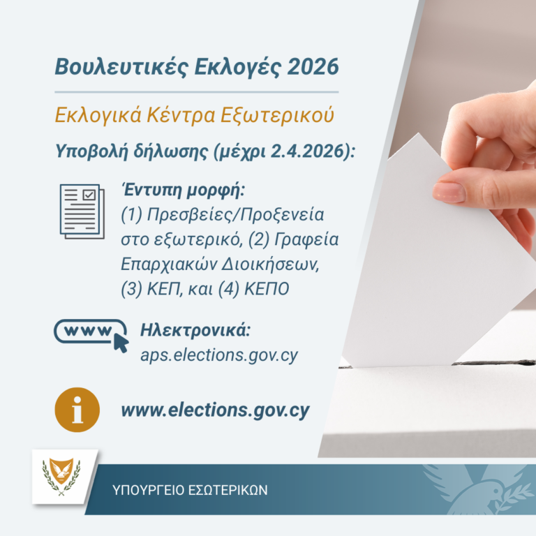 Το Υπουργείο Εσωτερικών της Κυπριακής Δημοκρατίας ανακοινώνει ότι, στις προσεχείς Βουλευτικές Εκλογές της 24ης Μαΐου 2026, θα λειτουργήσουν εκλογικά κέντρα στο εξωτερικό για τους εκλογείς που είναι ήδη εγγεγραμμένοι στον εκλογικό κατάλογο ή και θα εγγραφούν μέχρι τις 2 Απριλίου 2026. Για να καταστεί δυνατή η λειτουργία εκλογικών κέντρων στο εξωτερικό καταρτίζεται ειδικός εκλογικός κατάλογος, στον οποίο μεταφέρονται τα στοιχεία των εγγεγραμμένων εκλογέων...