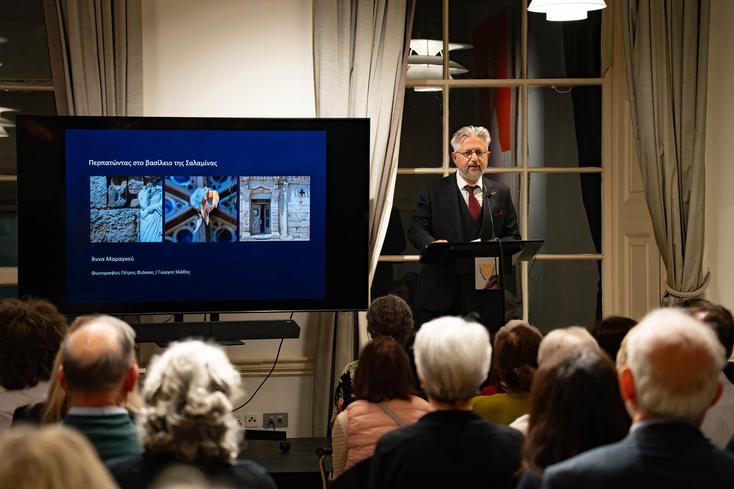 Η διακεκριμένη αρχαιολόγος και ιστορικός τέχνης Δρ. Άννα Μαραγκού παρουσίασε το νέο της έργο, την τριλογία «Περπατώντας στο Βασίλειο της Σαλαμίνας», συνοδευόμενη από τις φωτογραφικές προβολές του Πέτρου Φιάκκα. Την εκδήλωση χαιρέτισε επίσης ο Δρ. Γιάννης Τουμάζης, Διευθυντής του Πολιτιστικού Ιδρύματος Τράπεζας Κύπρου και πρώην Υφυπουργός Πολιτισμού της Κυπριακής Δημοκρατίας.